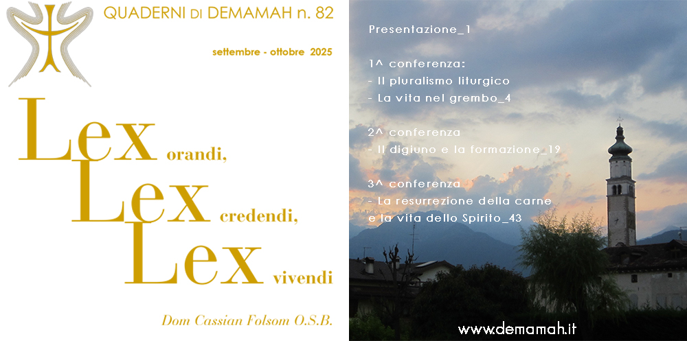 Demamah segnala che è in via di pubblicazione un Quaderno speciale: “Lex orandi, Lex credendi, Lex vivendi”, che conterrà le trascrizioni delle tre conferenze tenute in occasione del ritiro estivo di Demamah a Lentiai nel 2024 da Dom Cassian Folsom, fondatore e priore emerito dell’Abbazia di San Benedetto a Norcia.